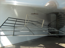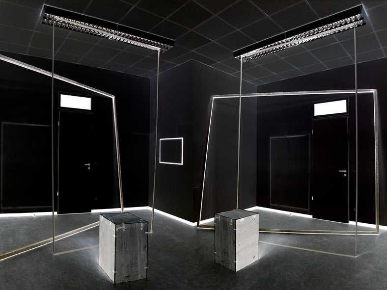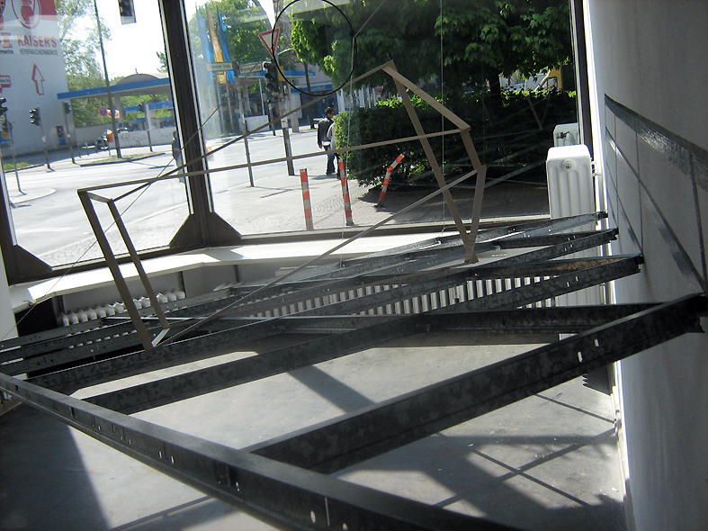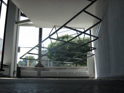 zerschneidet den realen Ausstellungsraum in allen Dimensionen und ist