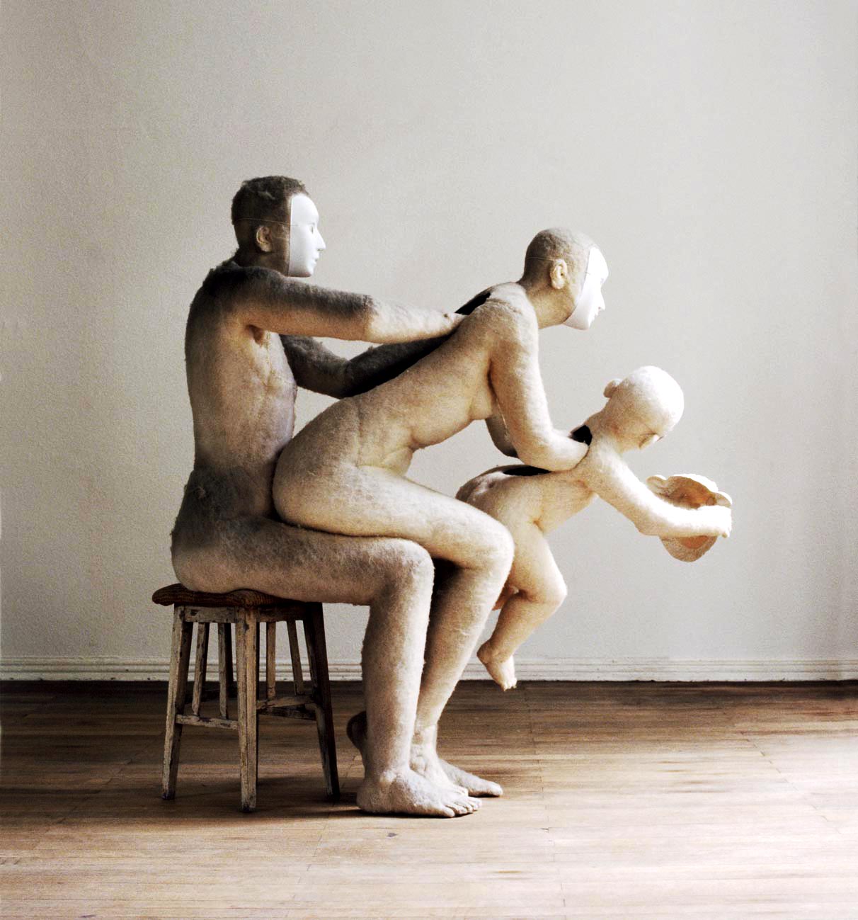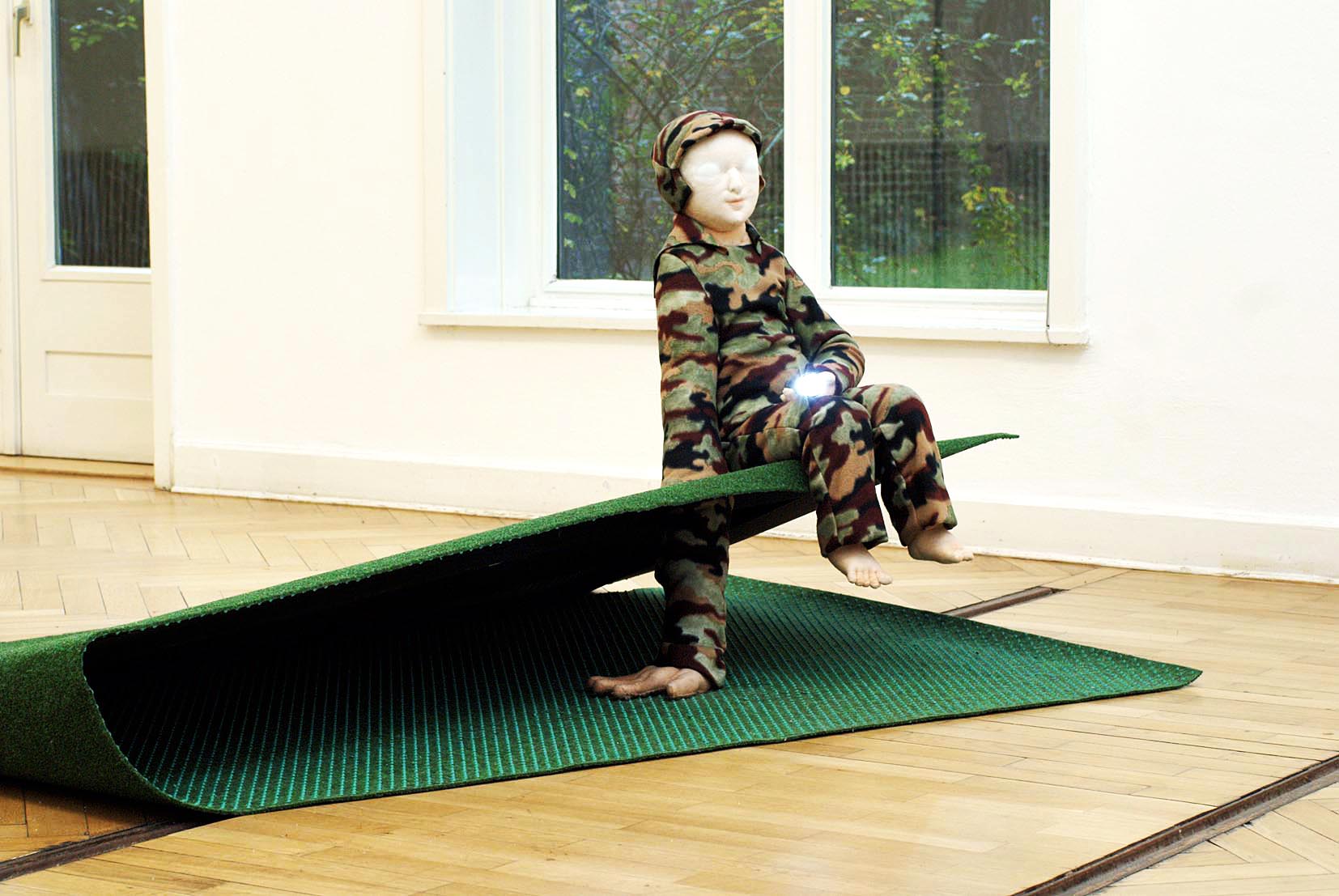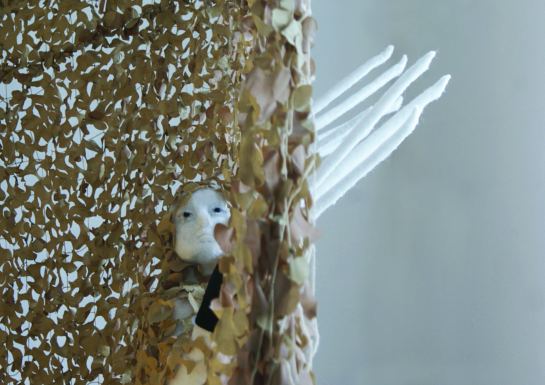 Nadine Rennert | Bild 1: Nadine Rennert, Selbdritt, 2008, Polyesterwatte, Puder, Masken, Holz, courtesy Nadine Rennert Bild 2: Nadine Rennert, Zukunft abbilden , 2008, Polyesterwatte, Kunstrasen, Taschenlampe, courtesy Nadine Rennert Bild 3: Nadine Rennert, A Process Without A Subject, 2008, Polyesterwatte, Tarnnetz, Lampe, courtesy Nadine Rennert |
